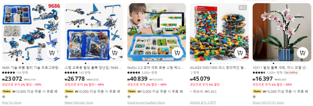 다양한 블록 세트를 저렴하게 판매하고 있고 있습니다. 이걸 쿠팡에서 구입하려면 블록 세트 하나에 7~8만원 정도에 구입해야 합니다. 왜냐 하면 구매 대행하는 업체들이 자신들의 마진을 추가해서 판매를 하고 있기 때문입니다.