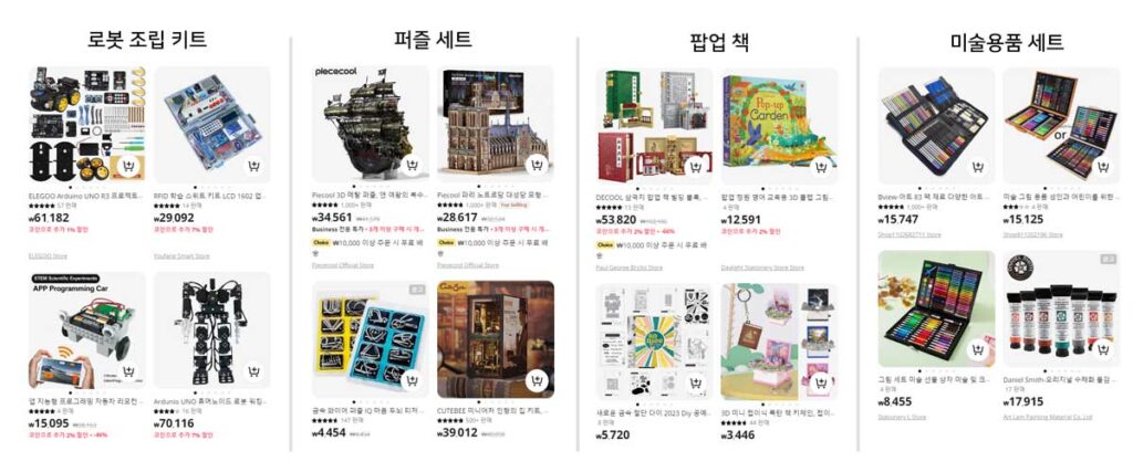 - 교육용 블록 세트: 아이들의 창의력을 키워주는 다양한 블록 세트.